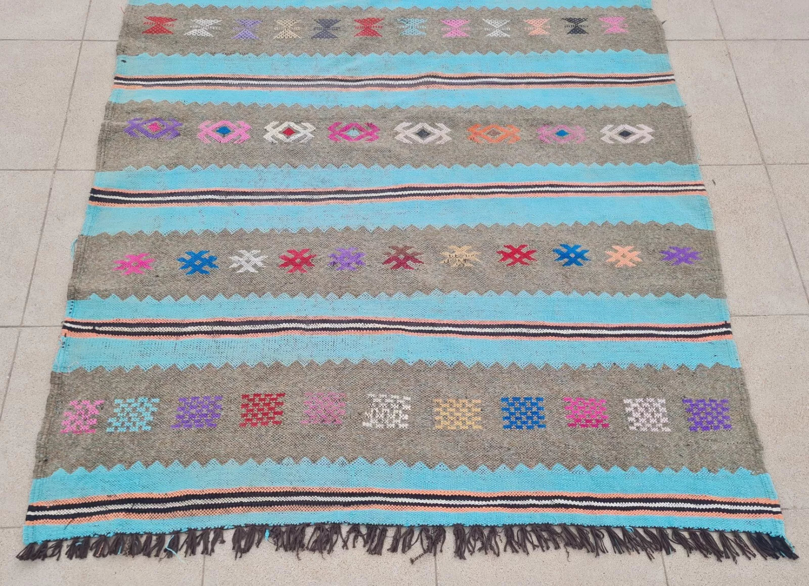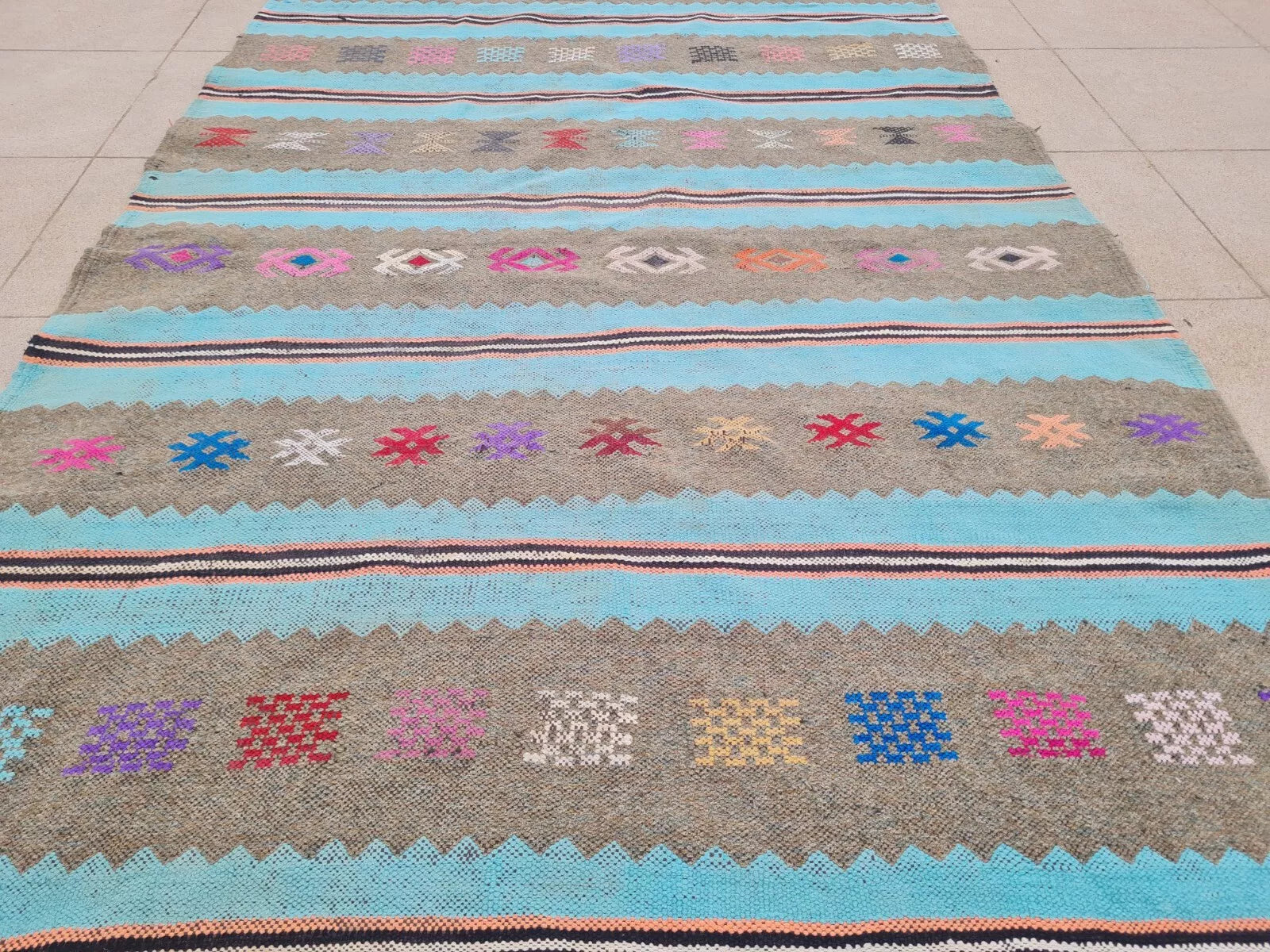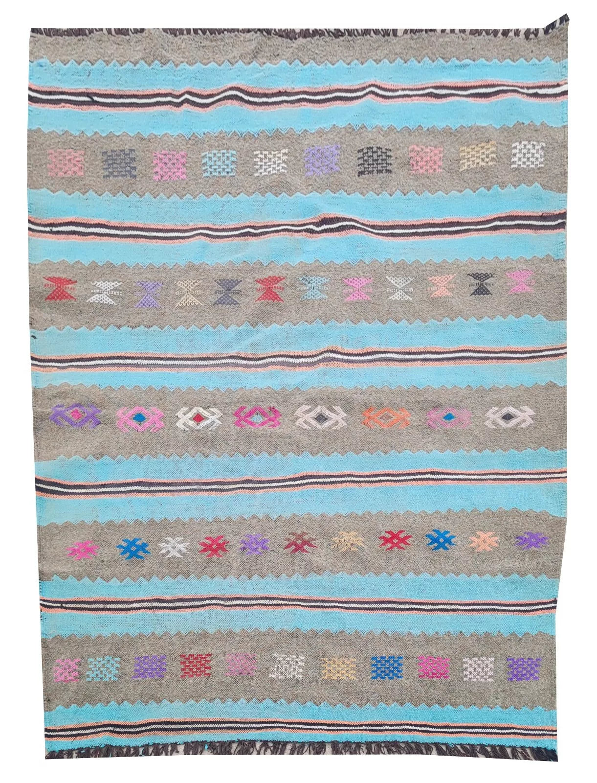 A pastel flatweave with broad turquoise and gray stripes, playfully accented by multicolored tribal “X” motifs. Its soft, summery palette brings a fresh, bohemian look.