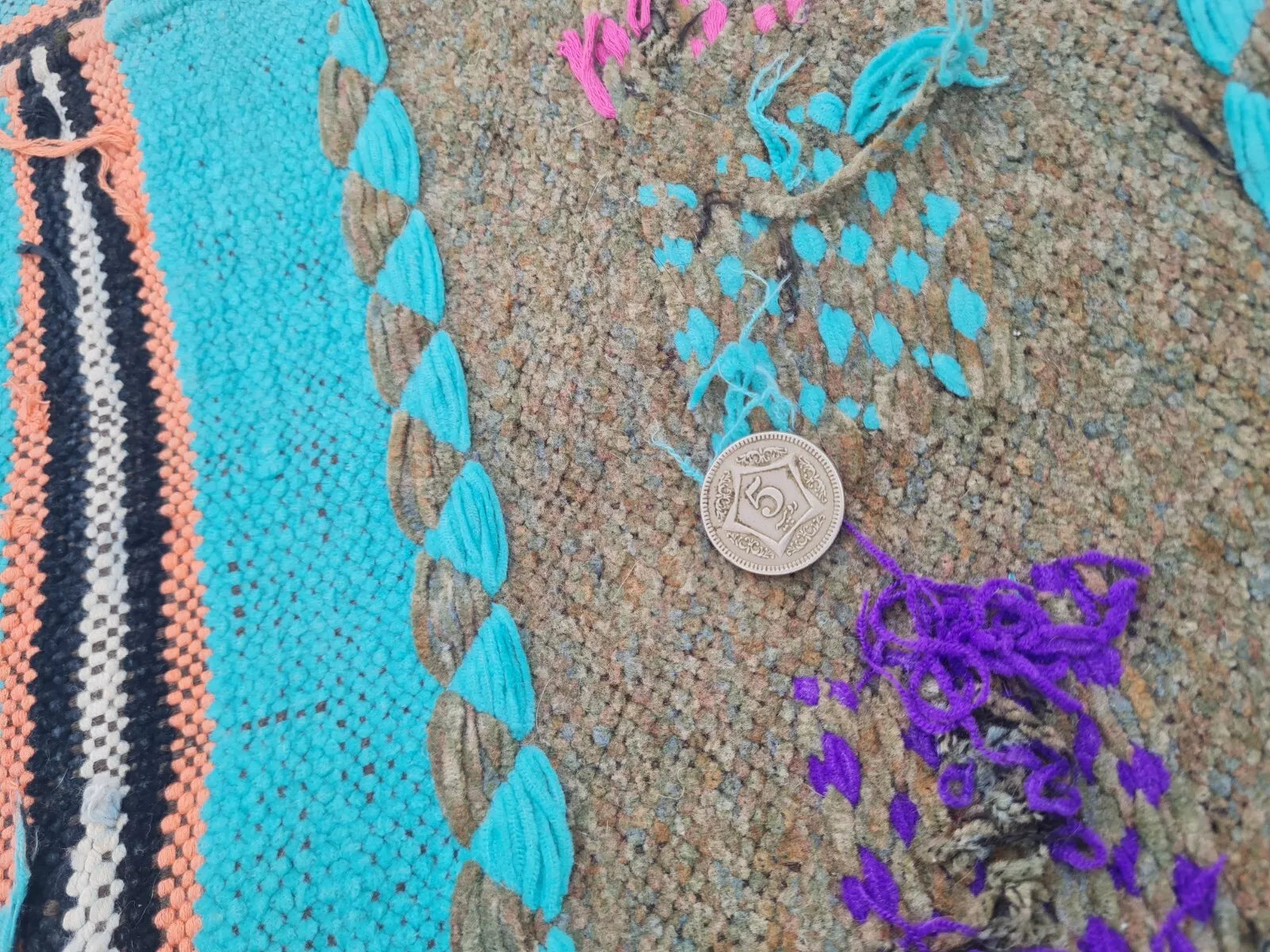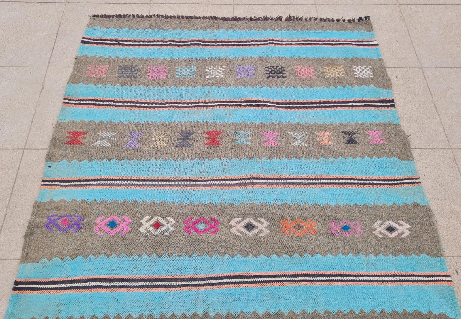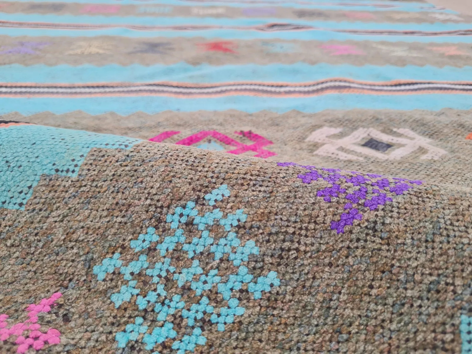 A pastel flatweave with broad turquoise and gray stripes, playfully accented by multicolored tribal “X” motifs. Its soft, summery palette brings a fresh, bohemian look.