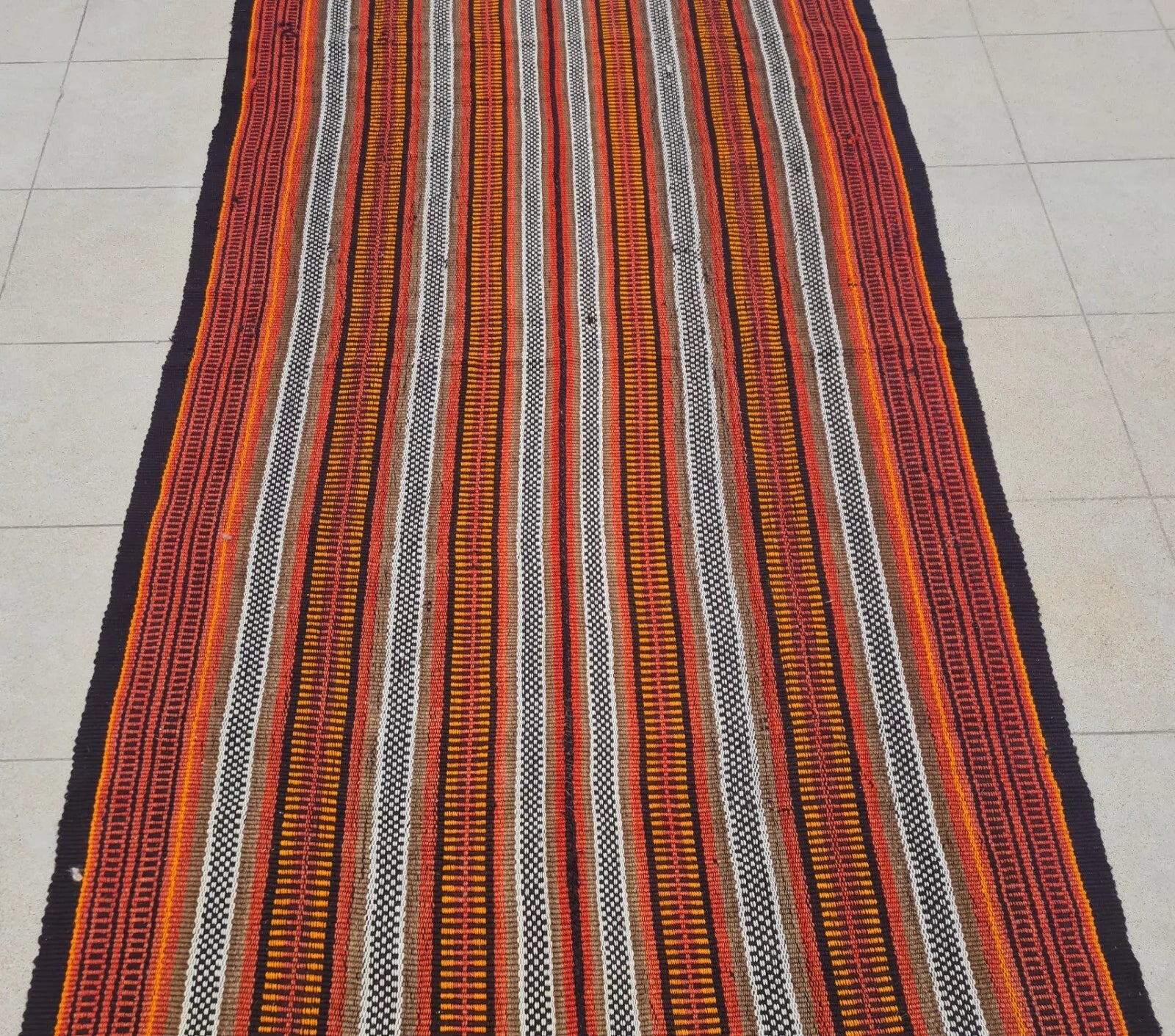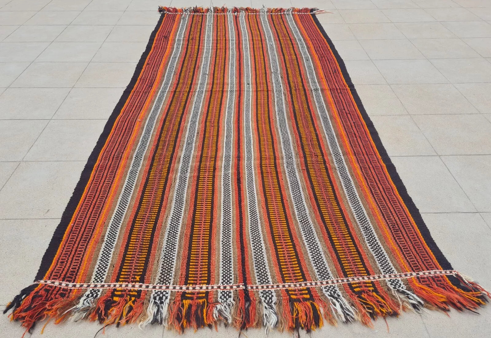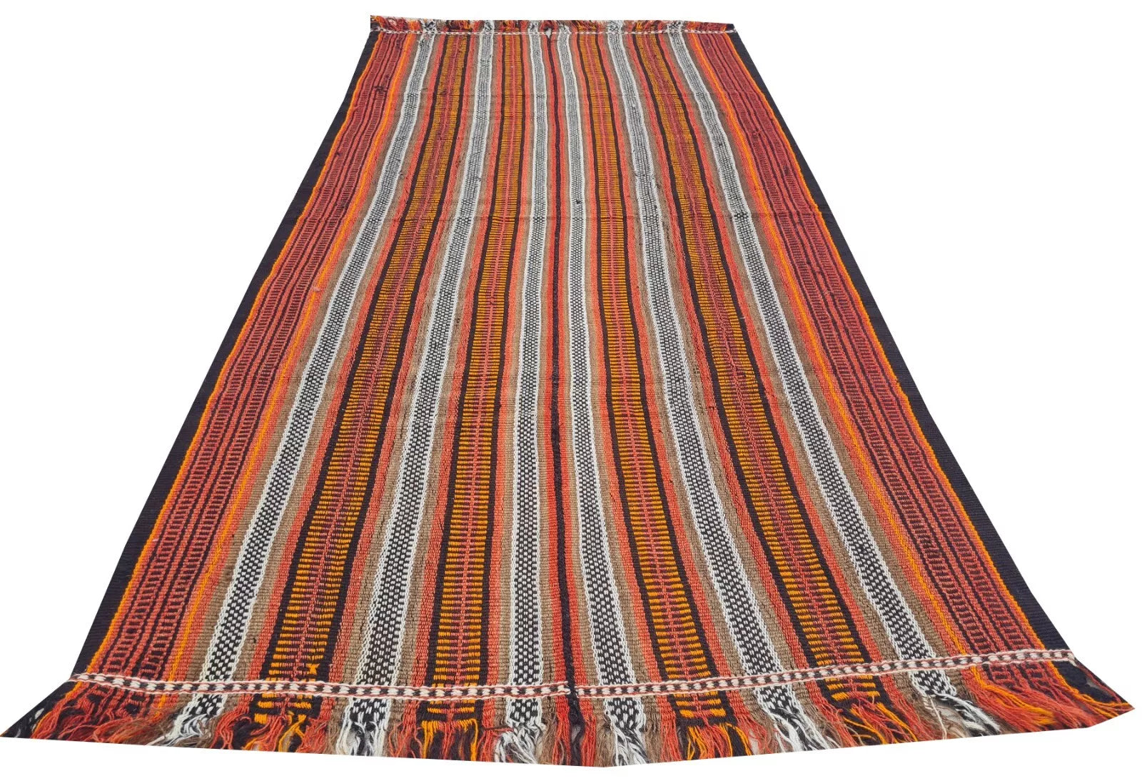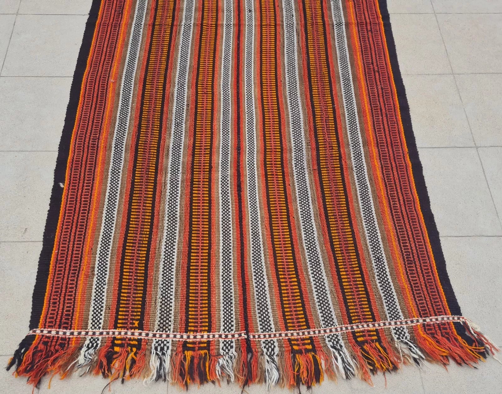 A narrow, handwoven runner showcasing brightly striped bands in warm oranges, reds, and neutrals. Fringed ends and small repeating patterns lend a rustic, bohemian look.