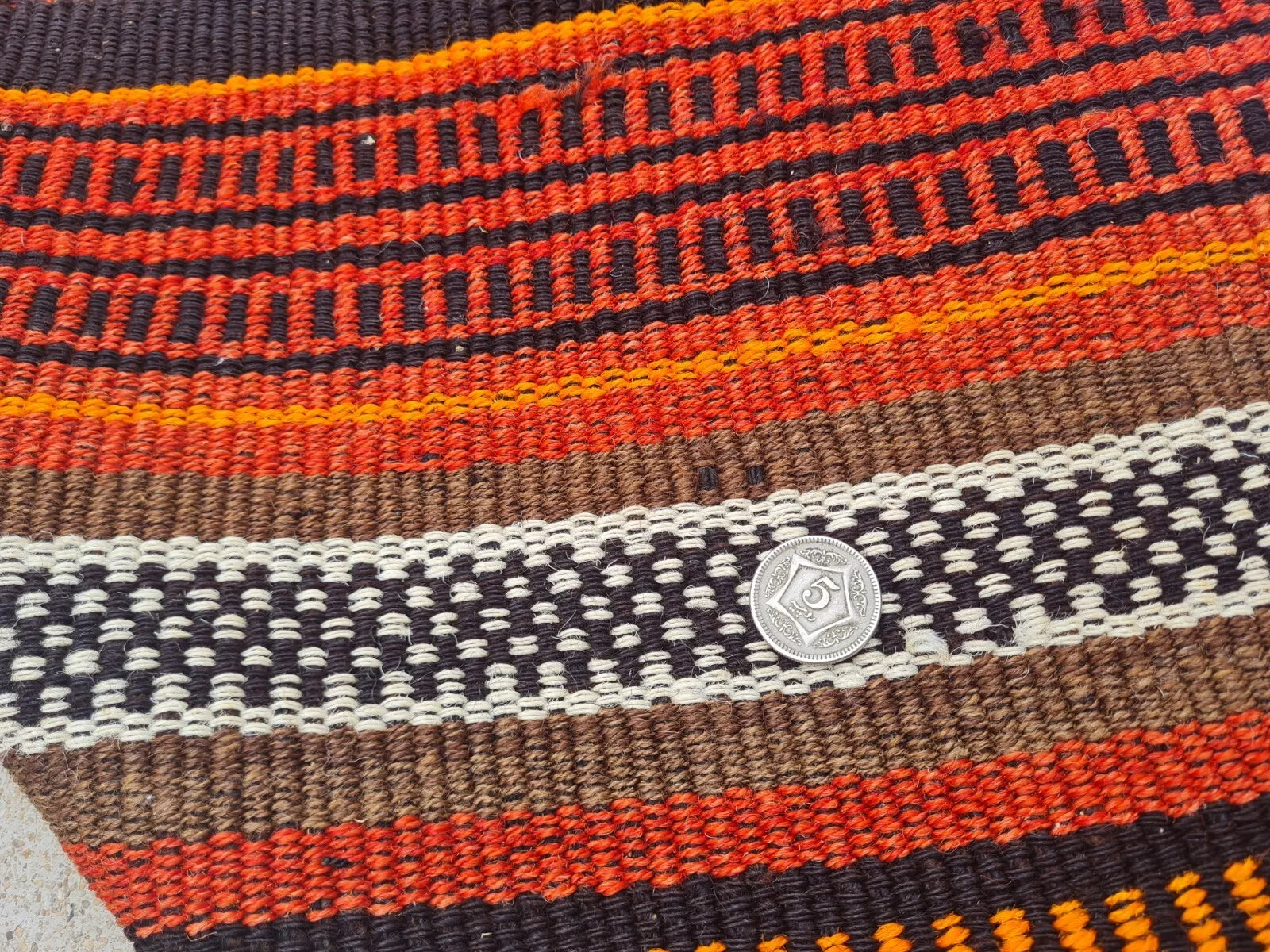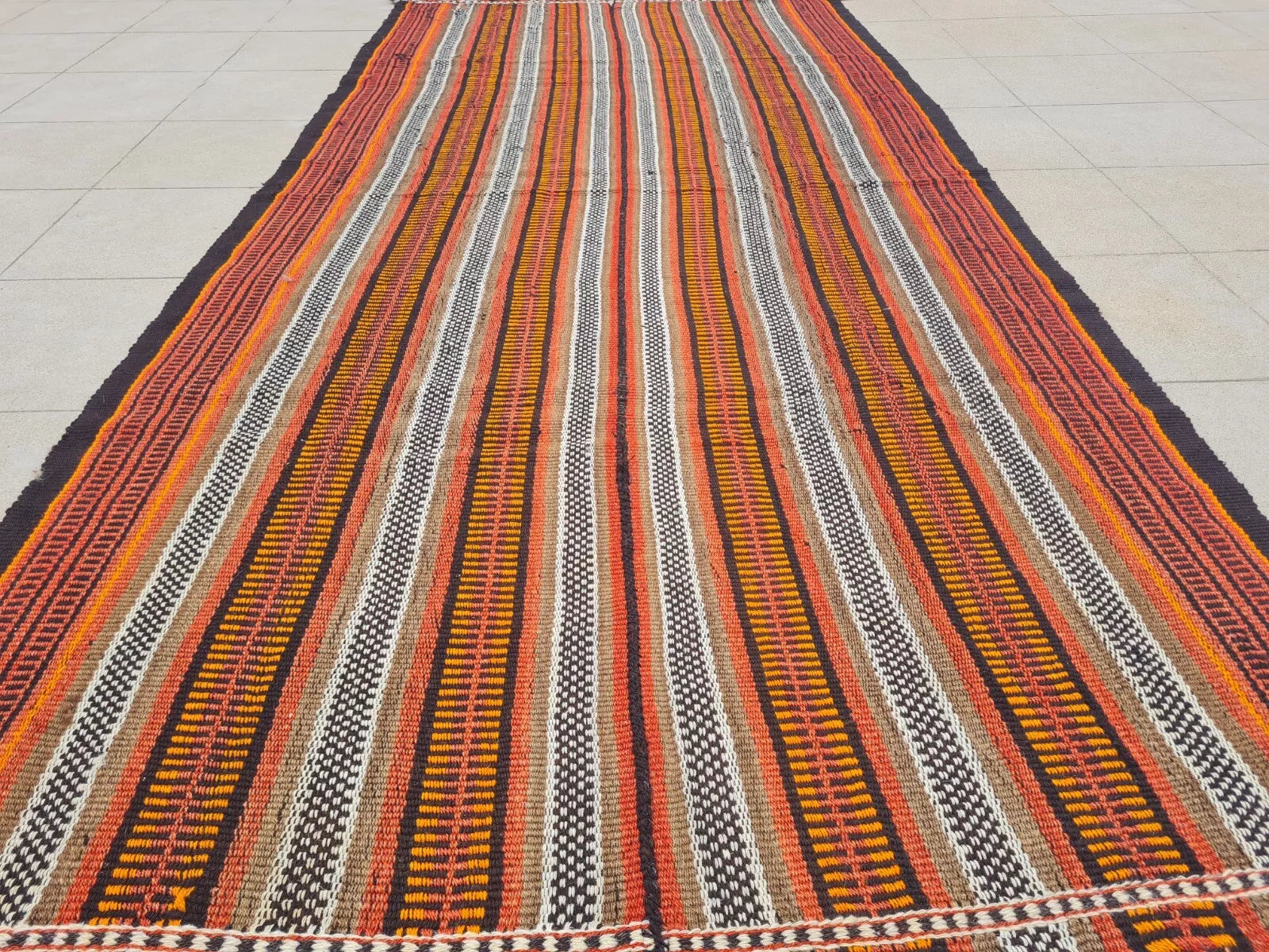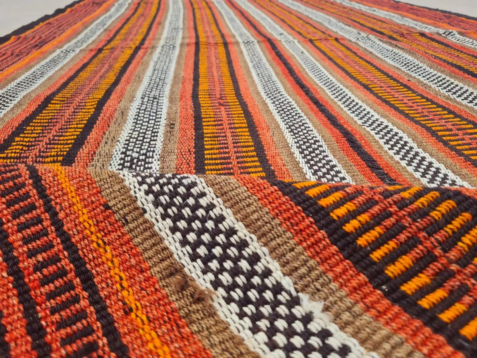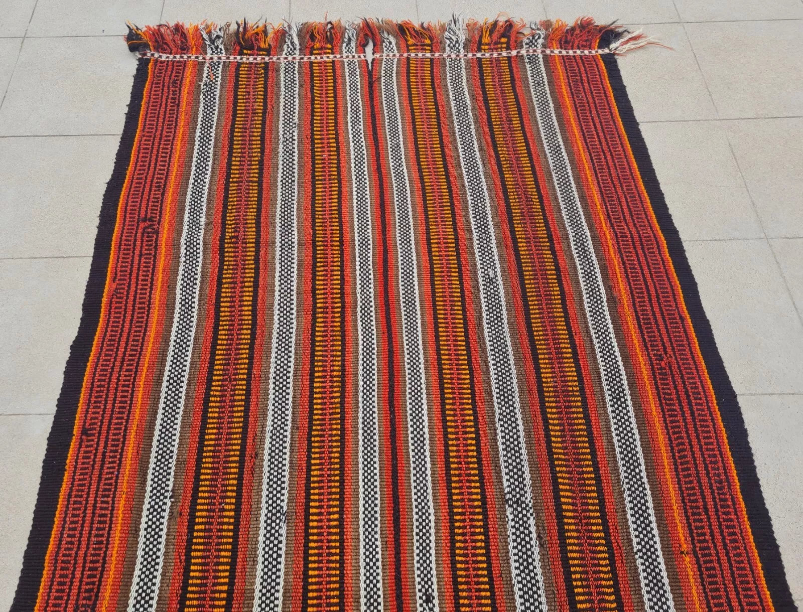 A narrow, handwoven runner showcasing brightly striped bands in warm oranges, reds, and neutrals. Fringed ends and small repeating patterns lend a rustic, bohemian look.