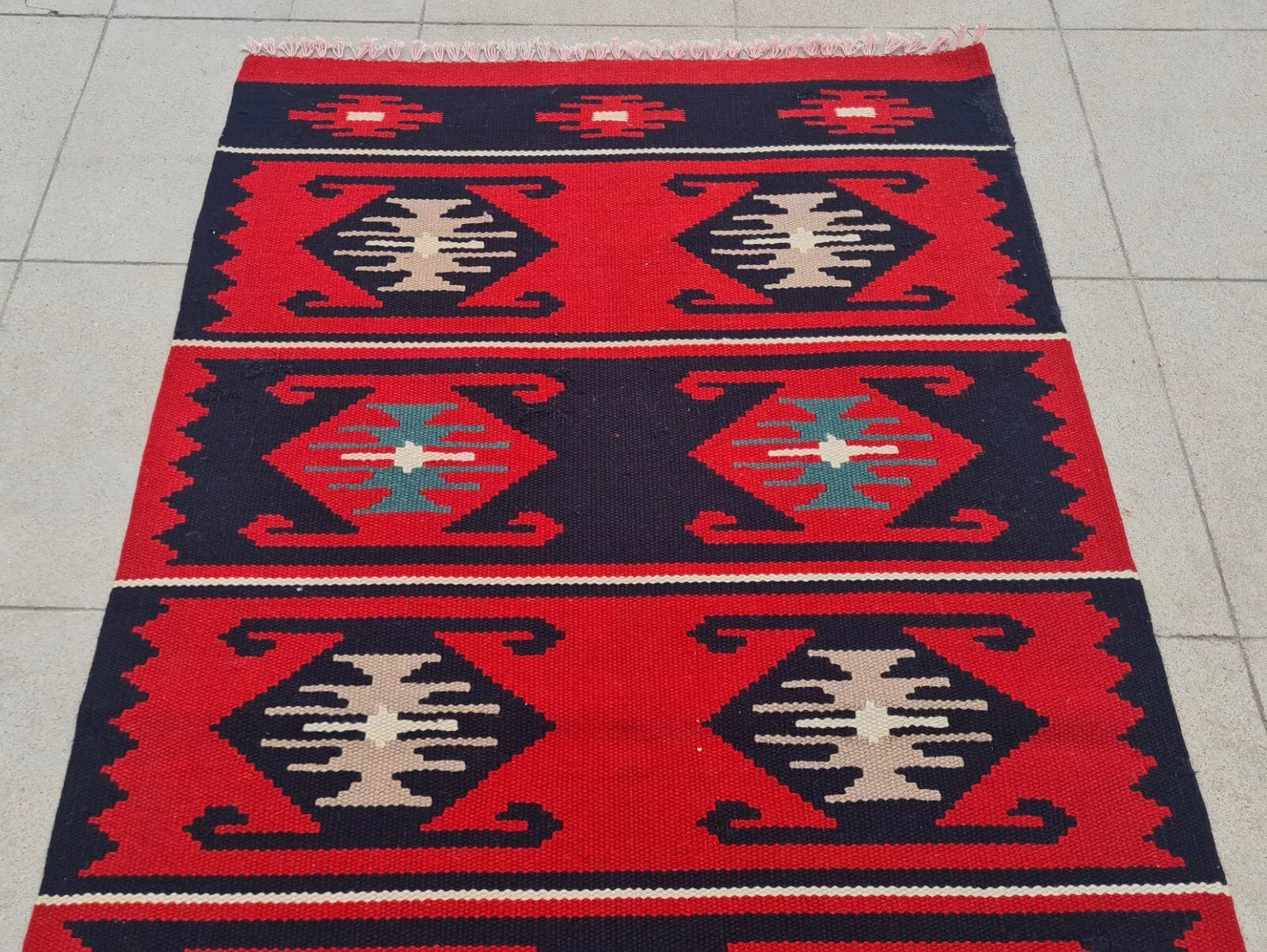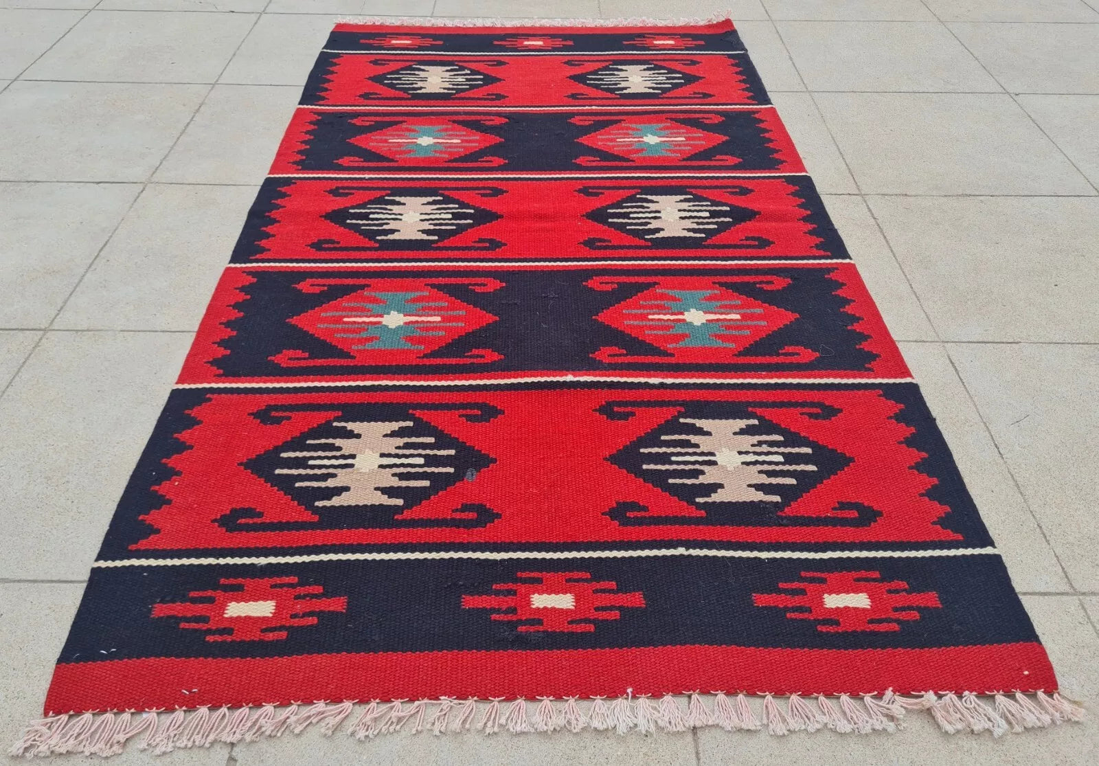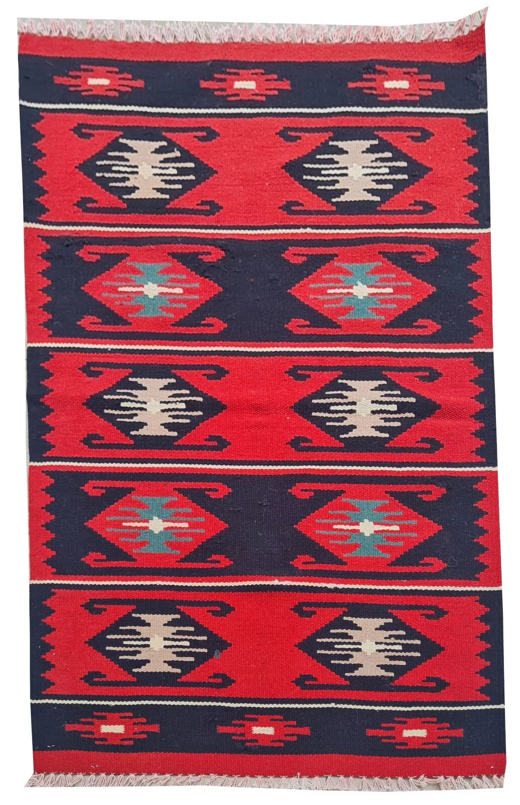 A bold kilim in vibrant red and navy stripes, each framed by traditional diamond patterns. Its graphic contrast and fringed ends exude rustic, tribal appeal.