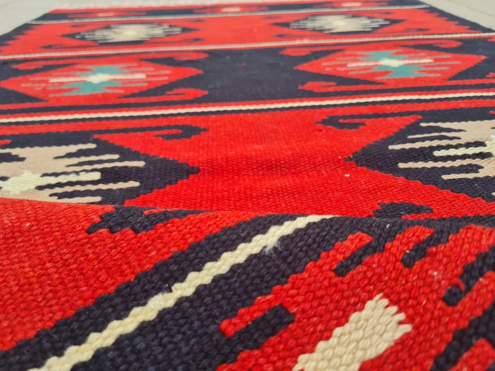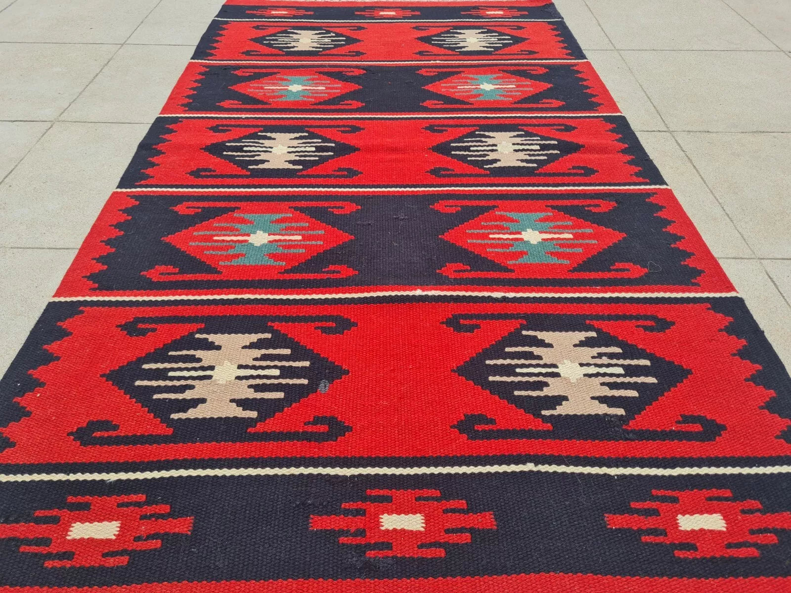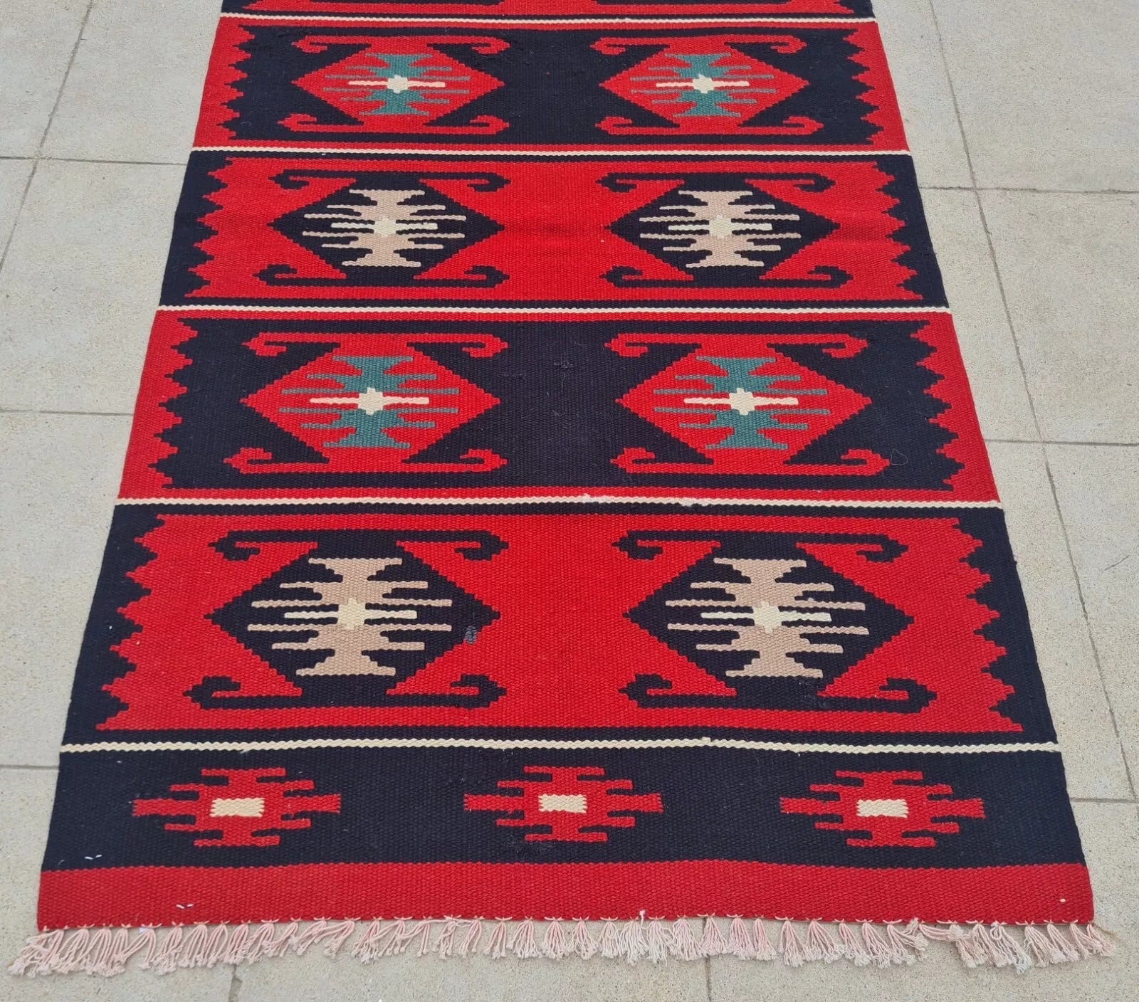 A bold kilim in vibrant red and navy stripes, each framed by traditional diamond patterns. Its graphic contrast and fringed ends exude rustic, tribal appeal.