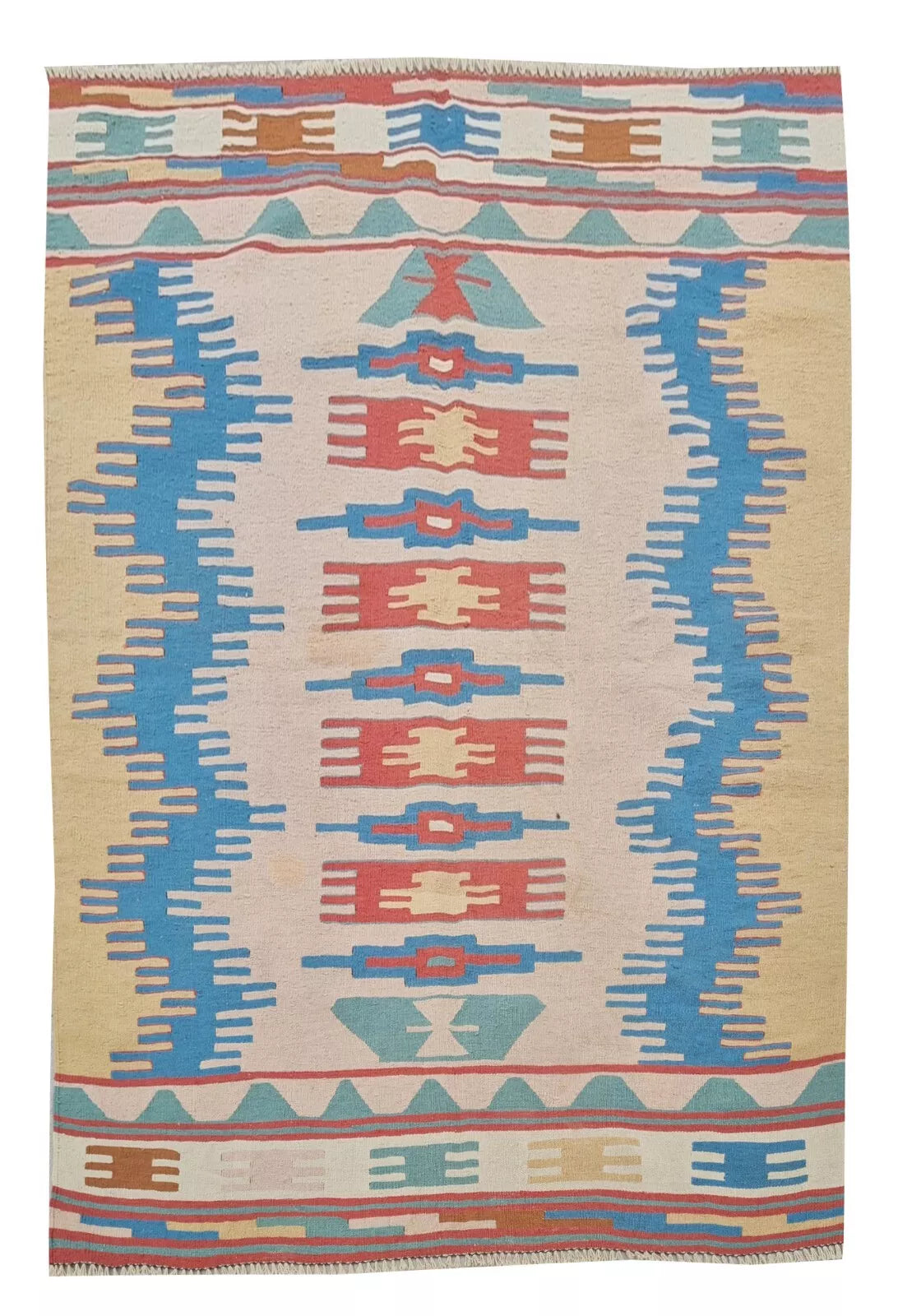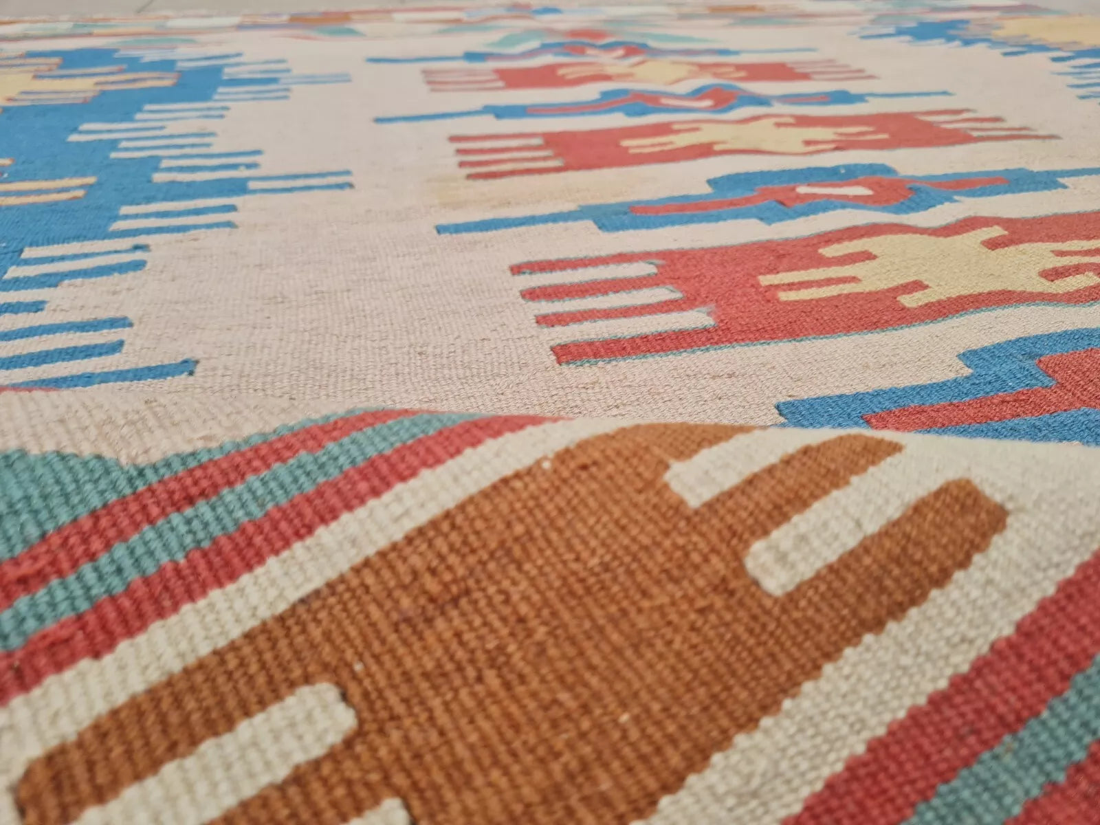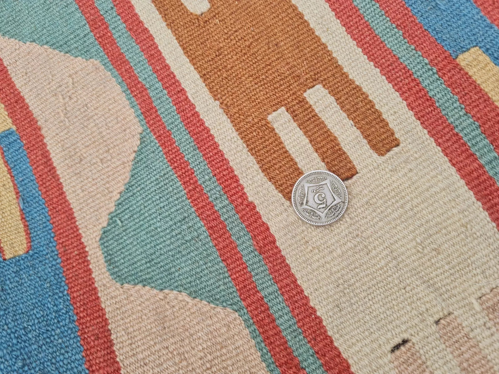 A more contemporary styled wavy kilim of azure, terracotta, beige, and teal.