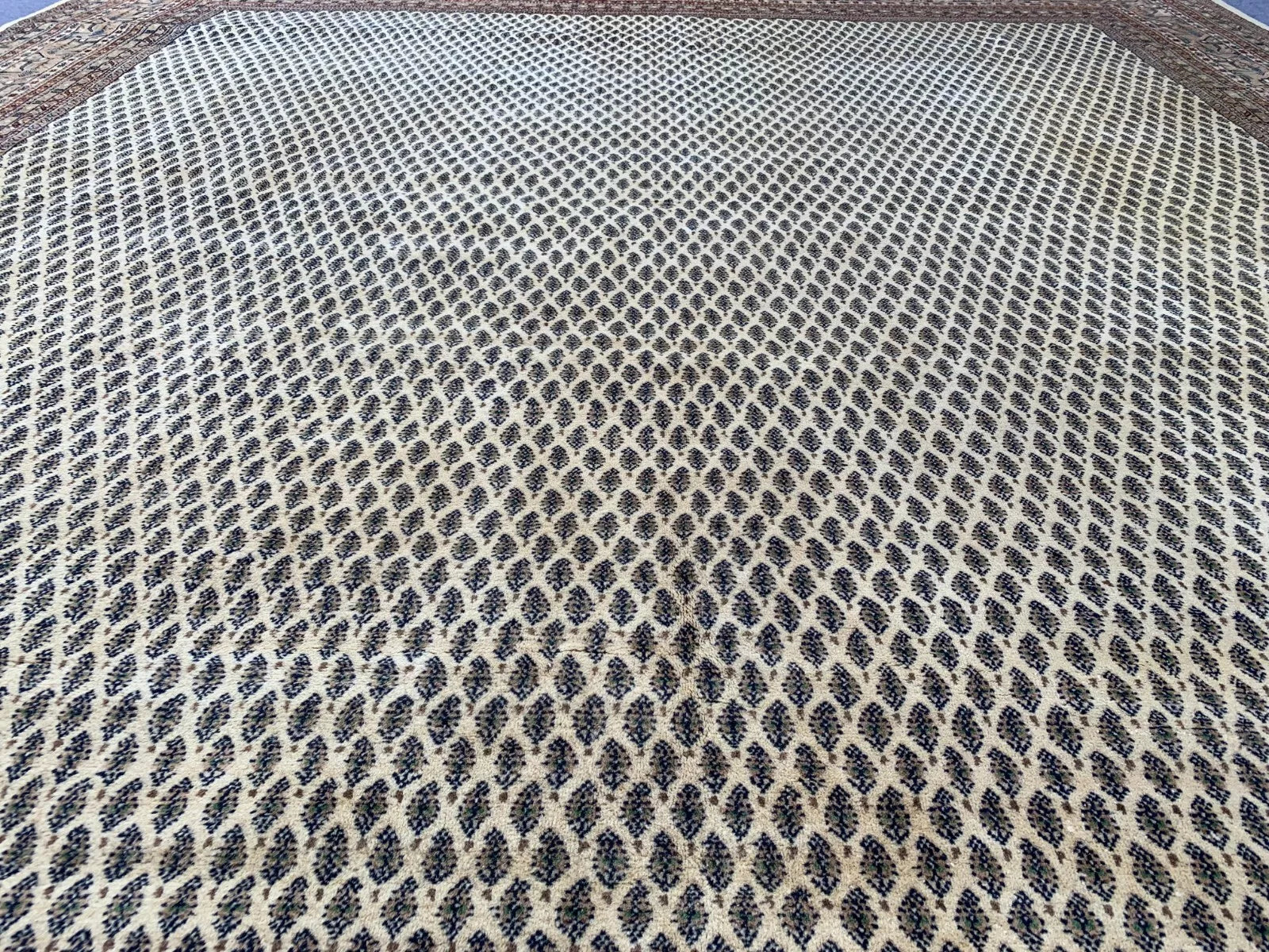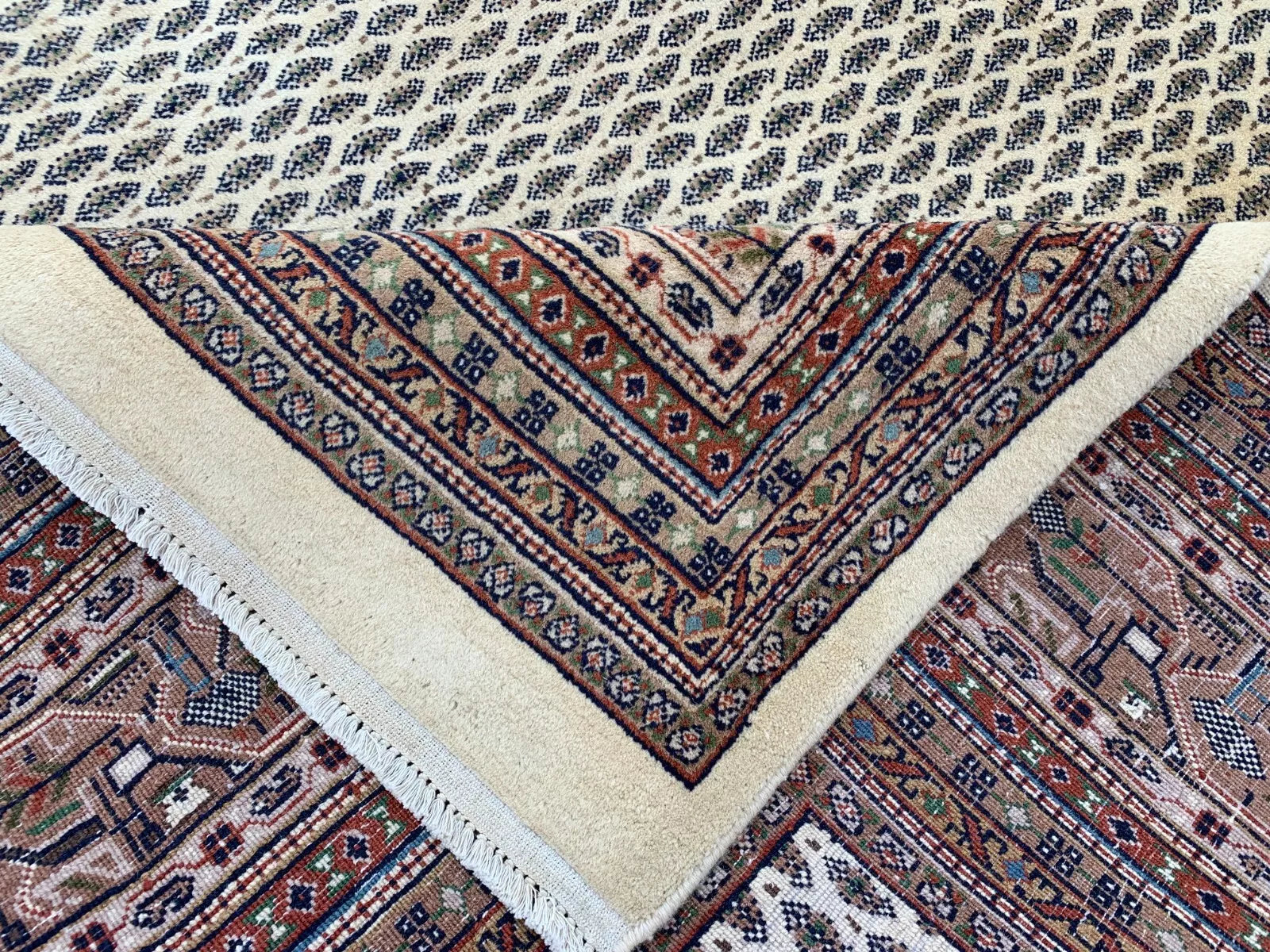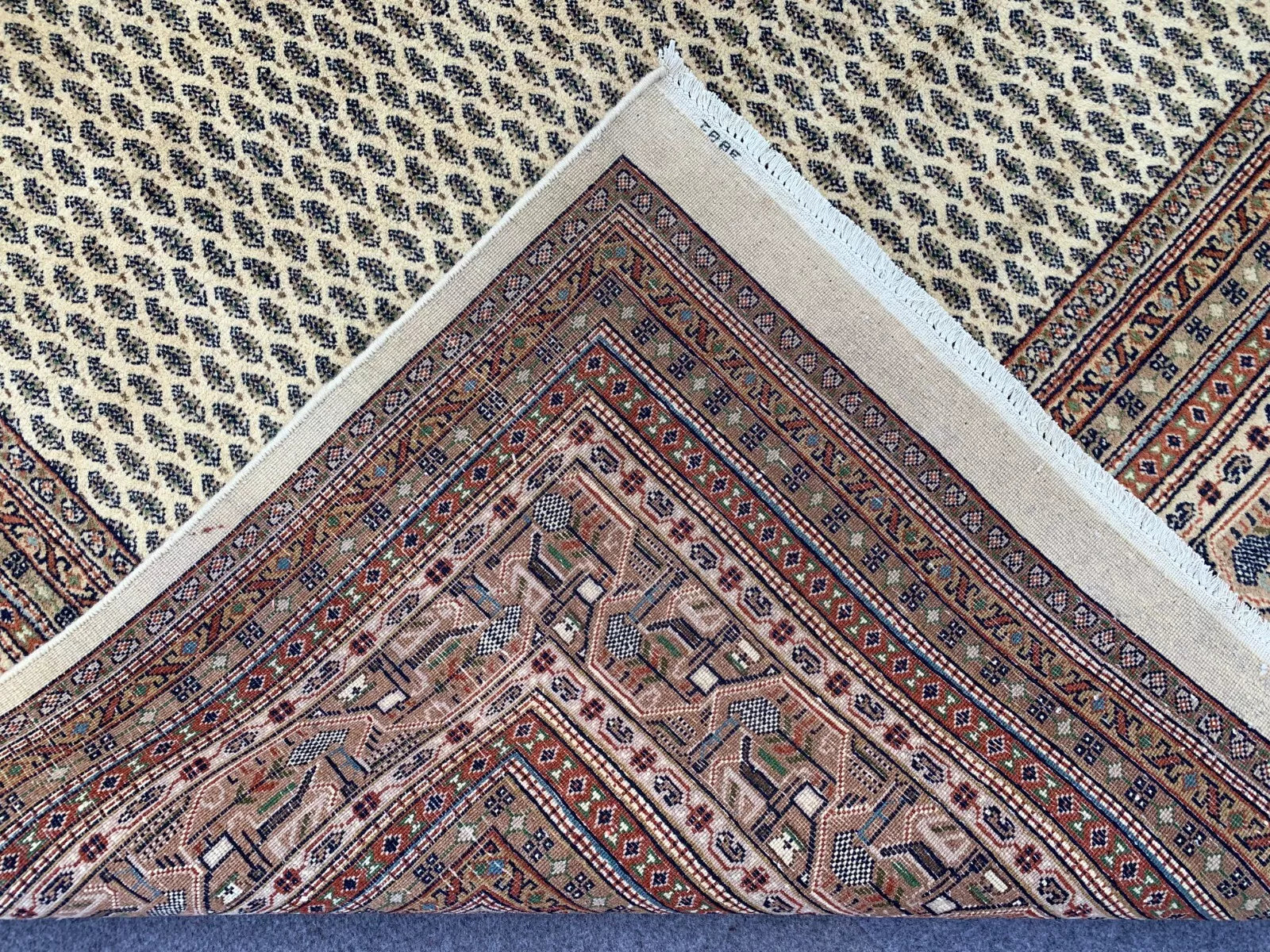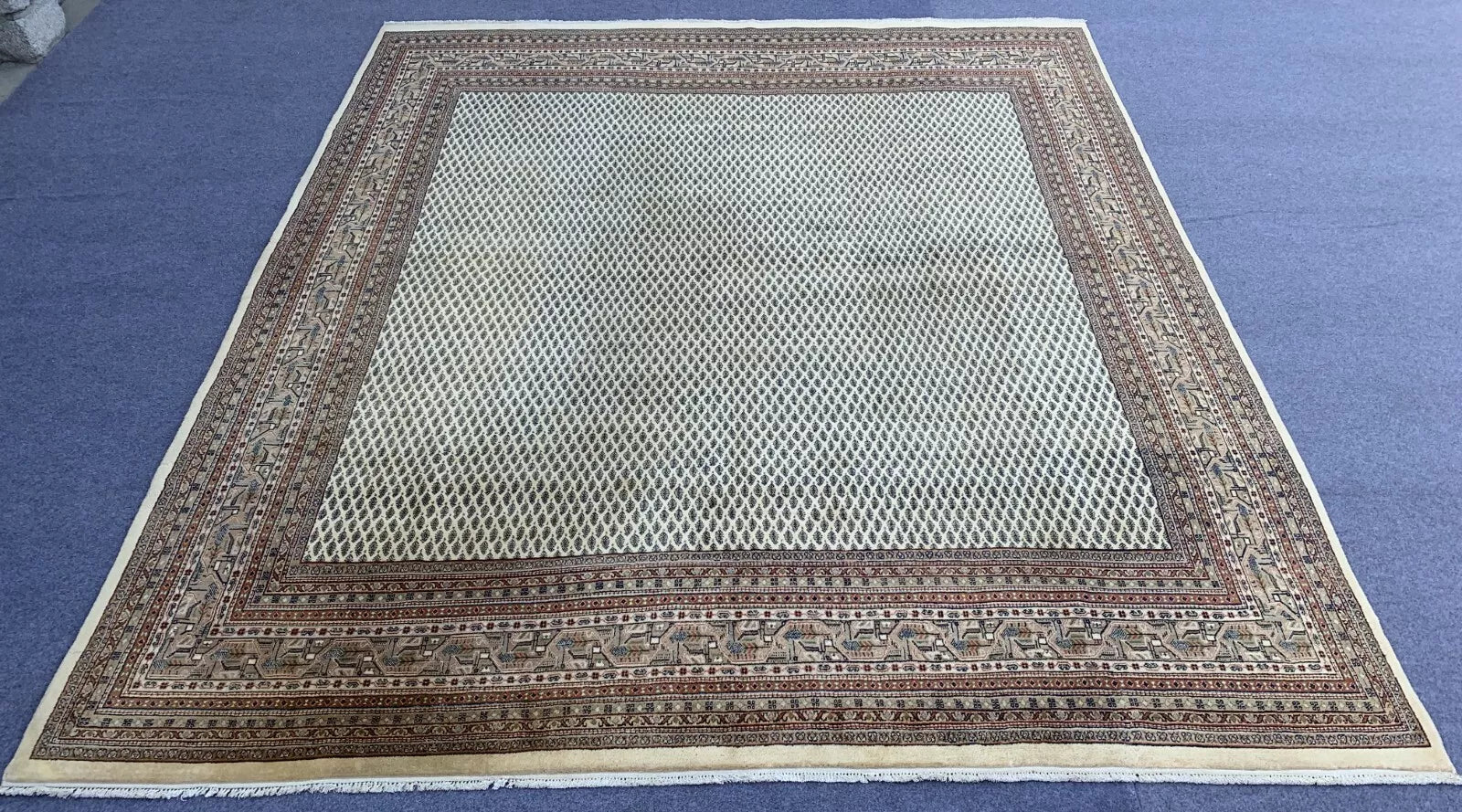 A spacious carpet in ivory tones, densely patterned with tiny repeating boteh symbols. Earthy borders adorned with stylized motifs add a subtle, traditional charm.