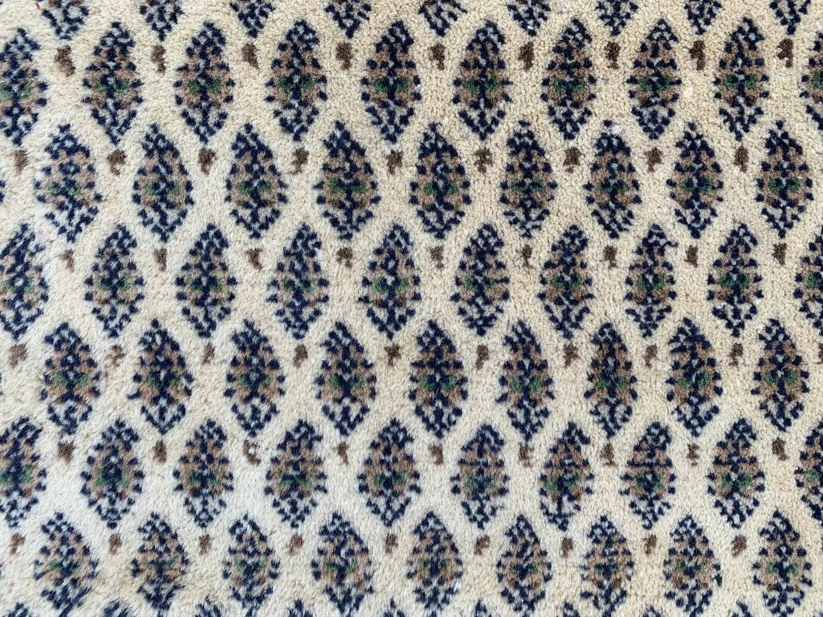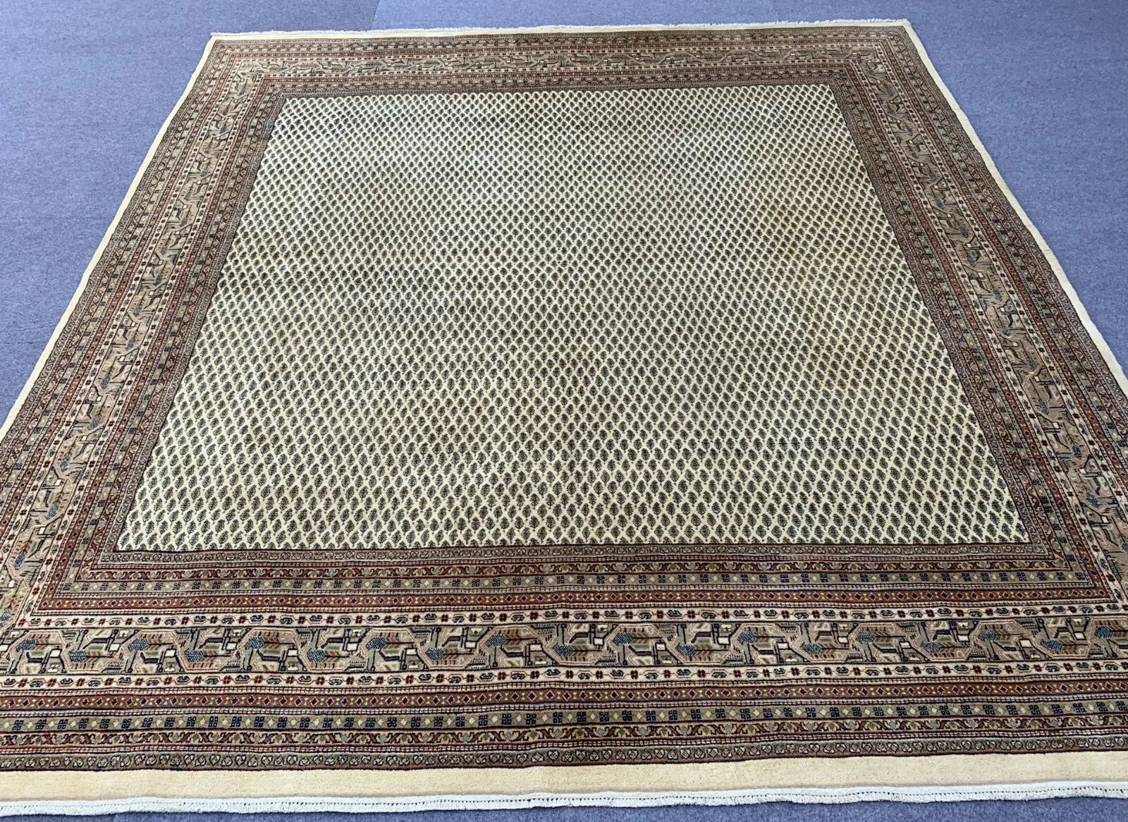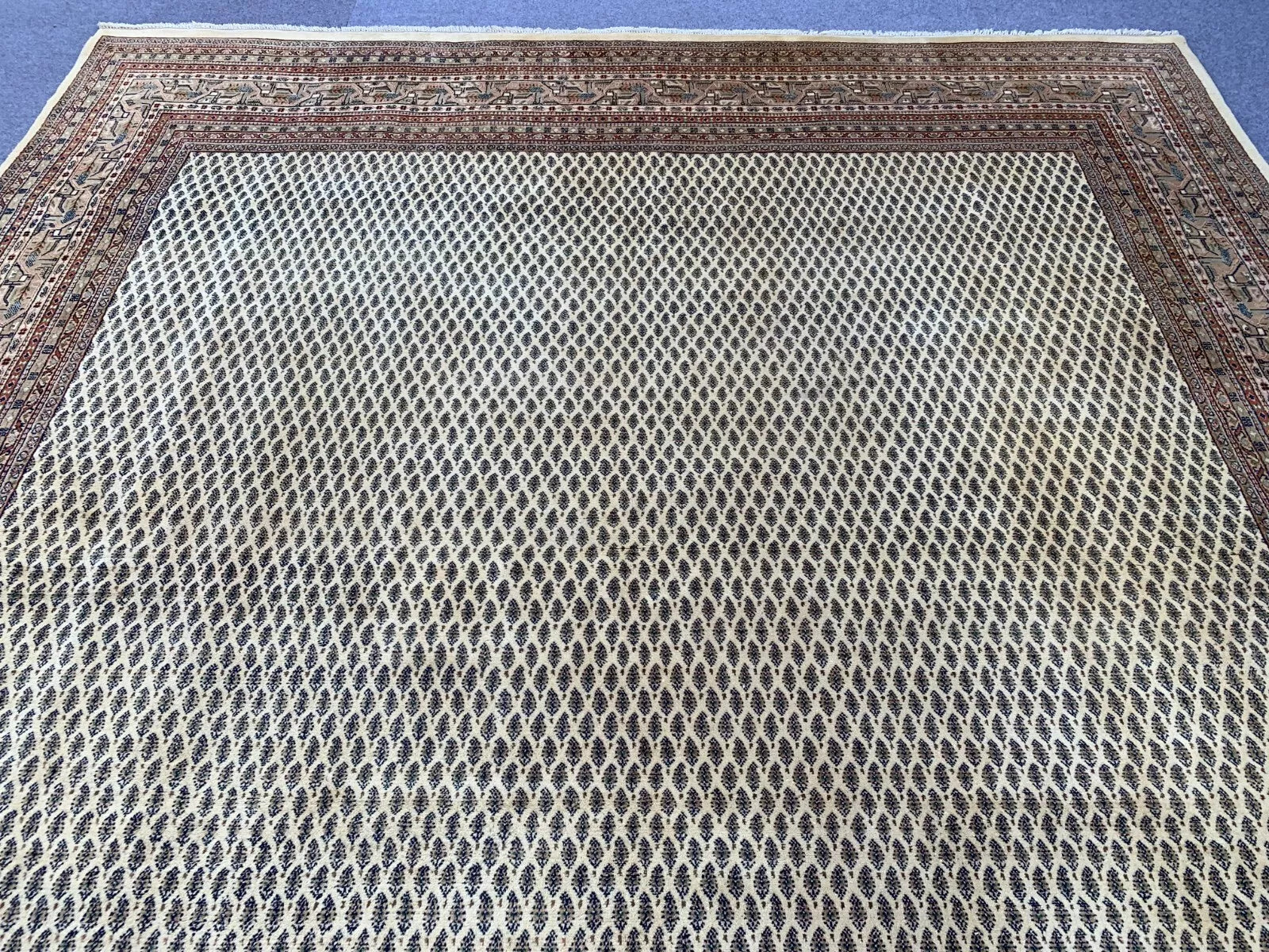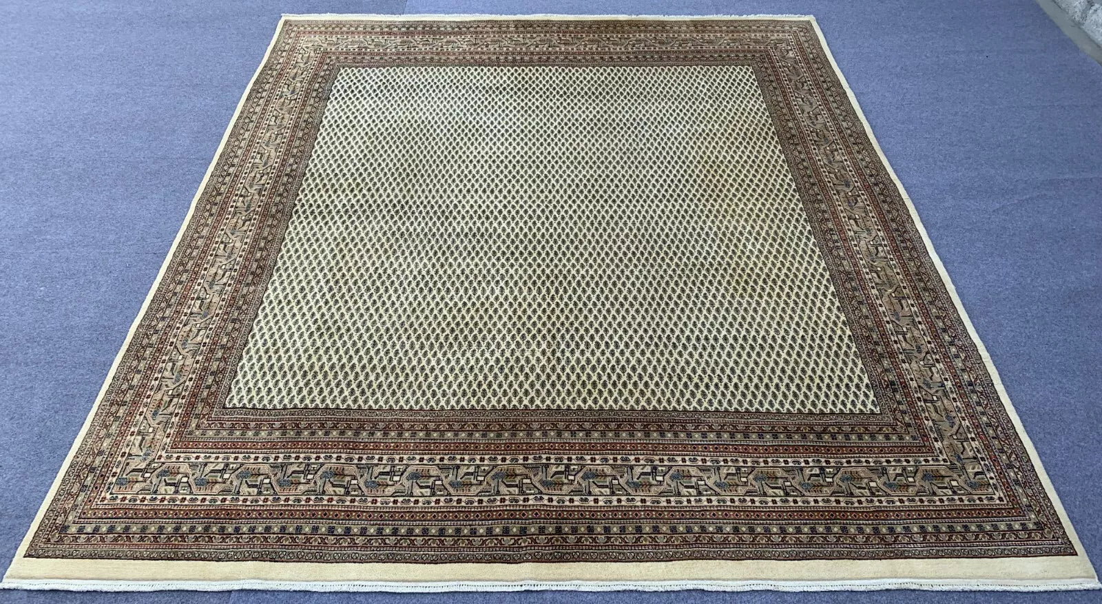 A spacious carpet in ivory tones, densely patterned with tiny repeating boteh symbols. Earthy borders adorned with stylized motifs add a subtle, traditional charm.