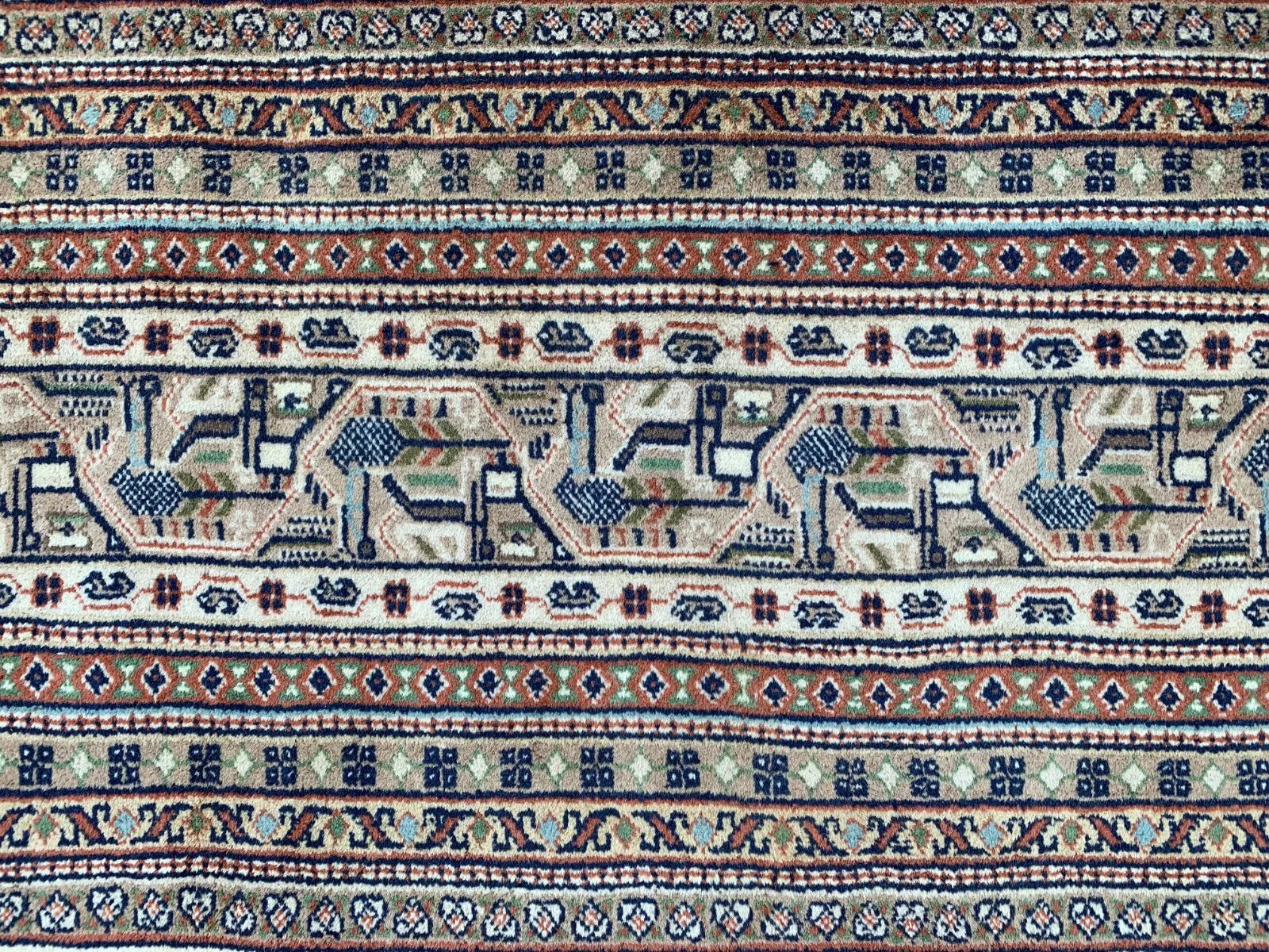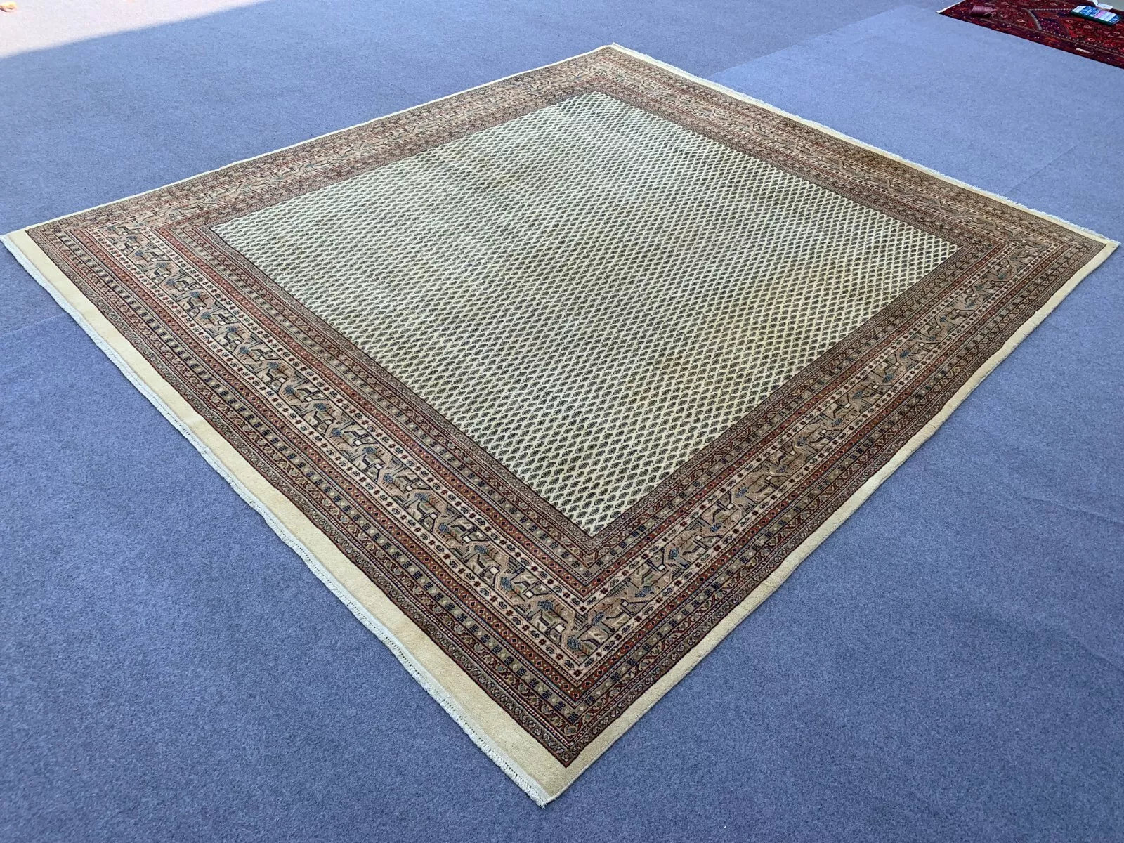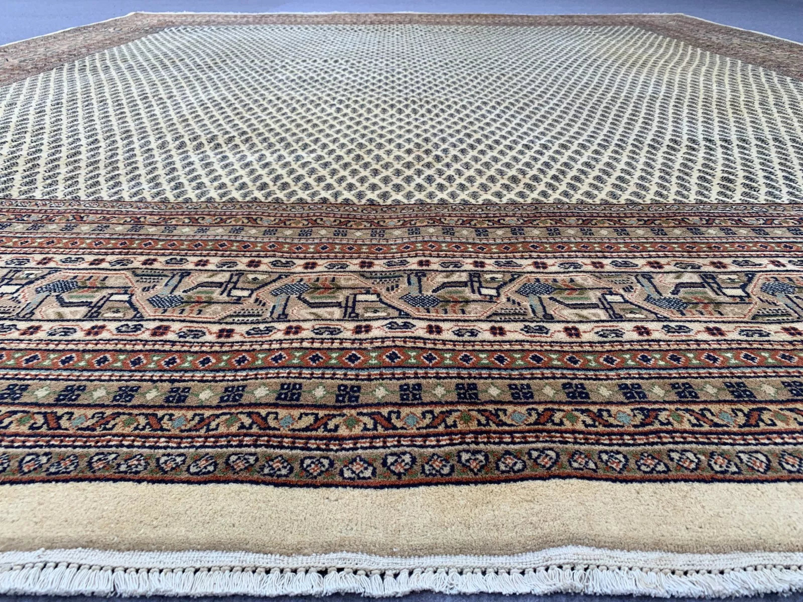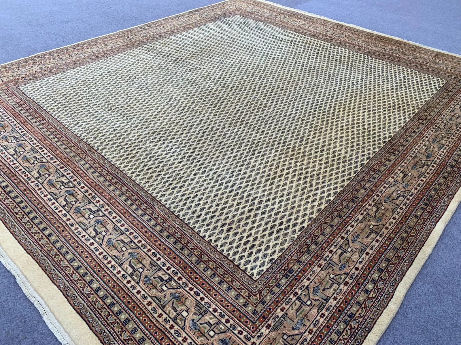 A spacious carpet in ivory tones, densely patterned with tiny repeating boteh symbols. Earthy borders adorned with stylized motifs add a subtle, traditional charm.